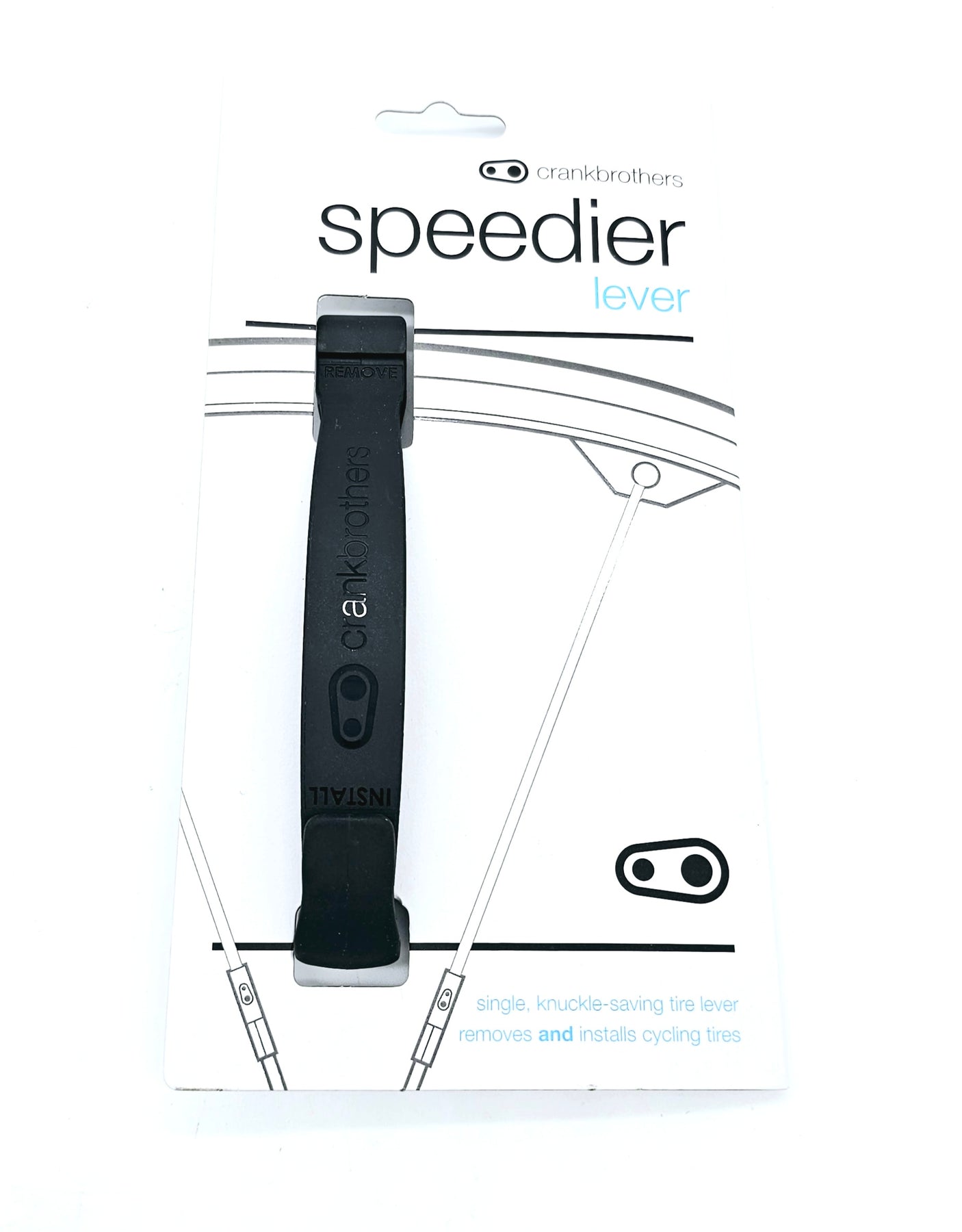 I present the revolutionary Crank Brothers Tire Lever. This single lever effortlessly removes and installs tires, protecting your knuckles from injury. Weighing only 26g and with a lifetime warranty, its compact length of 144mm makes it a must-have for any cyclist.