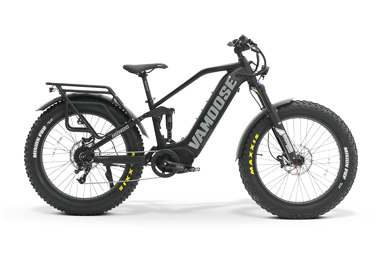 The Vamoose HONDO is a cut above the rest. With top-tier components including Tektro Dorado quad piston brakes, SRAM X5 9-speed derailleur, Rockshox rear suspension, and air front suspension, as well as distance leading 52V 20Ah battery with the dual-battery option, this cycle is a high-performing beast.